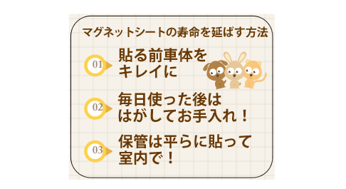 屋外で毎日使うと、マグネットシートの寿命は約2年程度です。 ちゃんとお手入れをしていますと毎日使っても、6年使いました!という方もいらっしゃいます。 マグネットシートの寿命を延ばす方法 貼る前車体をキレイに 毎日使った後…